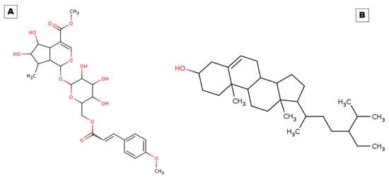 Two-dimensional structural representations of (A) arbortristoside E and (B) beta-sitosterol.