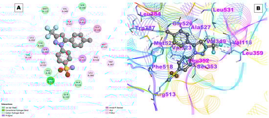 The results of this study also indicated the involvement of hydrophobic interactions between celecoxib and COX-2. The amino acids Val116, Leu359, Tyr335, Ser353, Leu531, His90, Gln192, Ala516, Leu384, Val523, Phe518, Trp387, Met522, Gly526, Leu352, Ala527, Val349, Ser530, and Met113 were found to be interacting with hydrophobic residues (Figure 2A,B). Hydrophobic interactions are non-covalent interactions that occur between non-polar molecules. In this case, the hydrophobic residues on celecoxib interact with the hydrophobic residues on COX-2, which helps to stabilize the binding interaction.