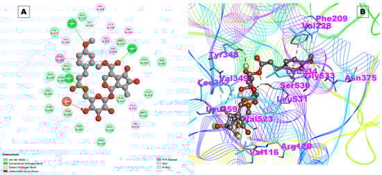 IL-17D is a less studied cytokine that is expressed by various tissues and cells, and it has been implicated in tumor suppression and viral infections. Beta_sito showed a high binding affinity with IL-17A, with a binding energy of −7.43 kcal/mol and a Ki of 3.60 uM (Table 2). Beta_sito formed a hydrogen bond with the Trp67 amino acid residue of IL-17A and formed 11 hydrophobic contacts with different residues of IL-17A. Beta_sito also showed a high binding affinity with IL-17D, with a binding energy of −8.22 kcal/mol and a Ki of 947.55 nM (Table 2). Beta_sito formed a hydrogen bond with the Val165 residue of IL-17D and formed nine hydrophobic contacts with various residues of IL-17D (Table 2). These results suggest that Beta_sito can bind to both IL-17A and IL-17D receptors and modulate their signaling pathways. However, the biological effects of Beta_sito on these cytokines are unclear and need further investigation. TNF-α and IL-1β are pro-inflammatory cytokines that mediate various inflammatory and immune responses. They are involved in diseases, such as rheumatoid arthritis, Crohn’s disease, ulcerative colitis, and Alzheimer’s disease. Inhibitors of TNF-α and IL-1β have been developed as anti-inflammatory drugs for these diseases. Beta-sito showed a high binding affinity with TNF-α, with a binding energy of −7.10 kcal/mol and a Ki of 6.20 uM. Beta_sito formed one hydrogen bond with the Gln67 residue of TNF-α and formed 10 hydrophobic contacts with several residues of TNF-α. Beta_sito also showed a moderate binding affinity with IL-1β, with a binding energy of −6.19 kcal/mol and a Ki of 29.24 uM (Table 2). Beta-sito formed one hydrogen bond with the Met148 residue of IL-1β and formed nine hydrophobic contacts with different residues of IL-1β. These results indicate that Beta_sito is a potent inhibitor of TNF-α and a moderate inhibitor of IL-1β, and it may have beneficial effects that modulate their inflammatory actions. Beta_sito also showed a higher binding affinity with TNF-α and IL-1β than their natural ligands, TNF receptor 1 (TNFR1) and IL-1 receptor 1 (IL-1R1), respectively. This implies that beta-sitosterol may interfere with the normal signaling of these cytokines [,,]. Prostaglandin F synthase (PGFS) showed a binding energy of −7.39 kcal/mol with an inhibition constant of 3.83 uM. No hydrogen bonds formed during the interaction. However, hydrophobic interactions were created by amino acid residues, namely, Arg223, Leu236, Gly220, Leu219, Ala218, Ala269, Tyr55, Ser217, Tyr55, Tyr24, Tyr216, Gly22, Asp50, Leu268, Thr23, Lys270, Gln222, and Ser221 (Table 2).