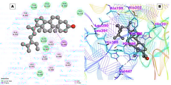 (A) Two-dimensional representation and (B) three-dimensional conformations of the interaction of the compound Beta_sito with COX-2.
