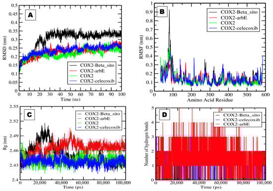 We performed a 100 ns MDS of the selected complexes of COX-2–Arb_E, COX-2–Beta-sito, and COX-2–celecoxib using the GROMACS version 2018 computational software [].