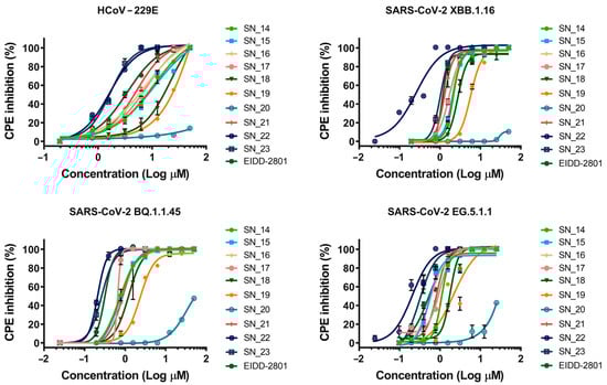 Dose-dependent inhibition of the cytopathic effect (CPE) of coronaviruses by the studied compounds. The data are presented as mean ± s.e.m. (n = 3).