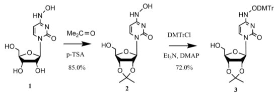 To obtain a β-D-N4-hydroxycytidine (NHC) derivative based on carboxylic acids, the vicinal 2′ and 3′ hydroxyl groups of NHC were protected using acetonide, followed by protecting of the hydroxyl group at the 4-position of N-4-hydroxycytidine with 4,4′-dimethoxytrityl chloride (DMTrCl) according to the method described in [] (Scheme 1).