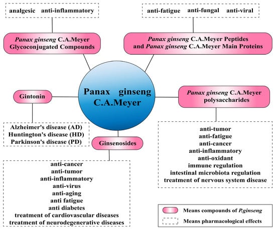 P. ginseng contains many bioactive and potentially effective therapeutic compounds. Wang et al. used the TCMSP database to screen the active ingredients of P. ginseng and found that a total of 190 chemical components have been identified, among which 22 are active components [13]. Numerous studies have found that the main types of compounds in P. ginseng include ginsenosides, gintonin, polysaccharides, peptides, and glycoconjugates. These active ingredients have been found to have various pharmacological effects and can provide good therapeutic benefits for different diseases (Figure 1). The various components and their active roles were reviewed in order to provide a theoretical basis for better development and utilization of P. ginseng.