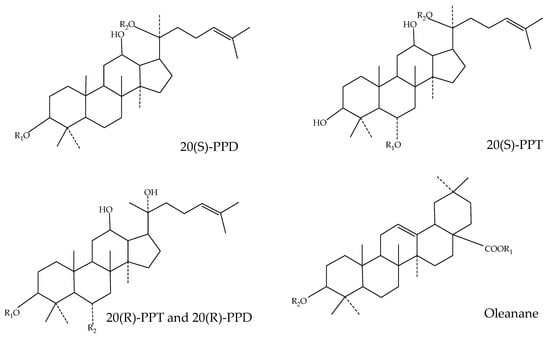 Ginsenosides are the main active ingredient in several parts of P. ginseng. Ginsenosides are steroidal glycosides. The reported ginsenosides are mainly classified based on the type of saponin, as well as the number, type, and site of glycosyl units. They can be classified as either dammarane or oleanolic acid based on the glycosidic backbone: a tetracyclic backbone with a sugar linkage portion or a pentacyclic backbone with oleanolic acid (OA) and C17 side chain variant (C17SCV) isoforms, respectively. According to the position of the sugar connection, the dammarane skeleton is further classified as a protopanaxadiol (PPD) or protopanaxatriol (PPT) ginsenoside, whose sugar components are connected at the third or sixth position of the triterpenoid structure, respectively [14]. The structural formulae of ginsenosides are shown in Figure 2 [15]. A total of 170 ginsenosides have been identified from different parts of P. ginseng, including 59 OA, 42 PPD, 65 PPT, and 17 C17CSV types. The composition of ginsenosides in different parts is significantly different. A total of 16 types of ginsenosides are commonly present in all tissues, including 9 PPD, 6 PPT, and 1 OA types (and no C17SCV). Among them, ginsenosides Rb2, Rb1, Rc, Rd, Re, Rf, Rg1, and Ro comprise the highest content in P. ginseng, accounting for more than 70% of total saponins. In addition, malonyl saponins containing malonyl groups have also been detected in different parts of P. ginseng. In the roots, rhizomes, leaves, stems, and fruits, protopanaxadiol-type ginsenosides predominate, whereas higher proportions of malonyl- and C17SCV-type ginsenosides are found in the flowers and buds [2].