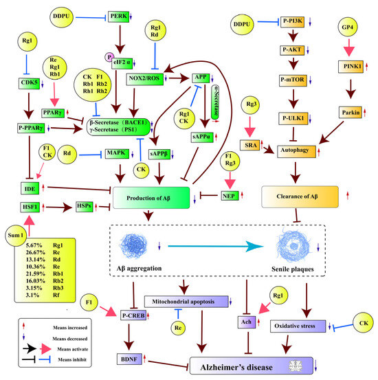Aβ aggregation further regulates downstream signaling pathways and promotes the generation of other pathogenic mechanisms. Active substances in P. ginseng have been found to not only regulate the downstream pathways of Aβ, but also improve other pathological conditions caused by Aβ as a way to combat AD.