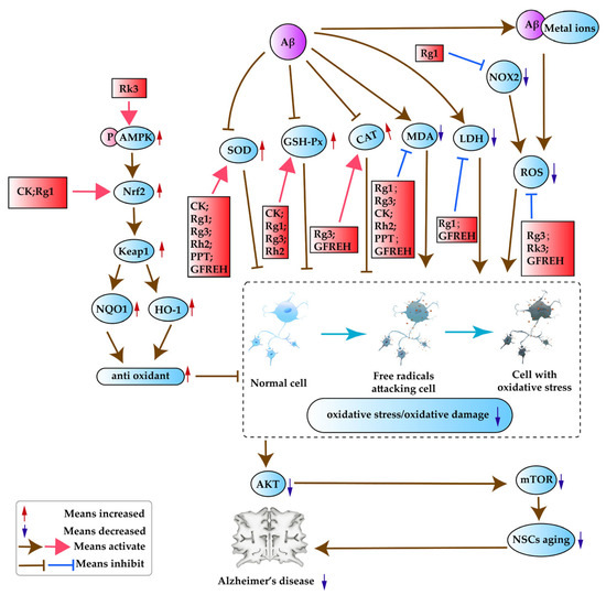 Oxidative stress is an important pathogenic factor in the development of AD. In addition to the effects on multiple signaling pathways, the effects of P. ginseng on oxidative stress include the scavenging of ROS and the modulation of multiple oxidoreductases, as shown in Figure 5.
