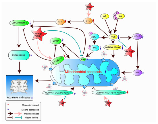 Studies have shown that mitochondrial dysfunction is a pathological change that usually occurs in the early stages of AD. Mitochondrial damage usually leads to synaptic damage, apoptosis, and neuronal degeneration [98]. The effects of signaling pathways on apoptosis and anti-apoptosis proteins are mainly responsible for P. ginseng’s ability to ameliorate mitochondrial damage, as shown in Table 5 and Figure 7.