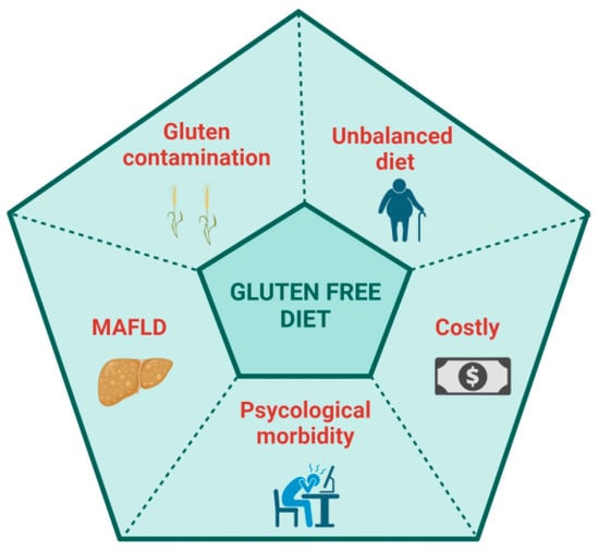 The risk of contamination and the difficulty of diet adherence make the GFD a restrictive diet, affecting the patient’s quality of life (QoL) and impacting social events, relationships, and work. The previous literature has paid attention to the QoL of CeD patients, both at diagnosis and while on a GFD, mainly finding a reduction in QoL at diagnosis, which improves once on a GFD [59]. Nachman et al. observed that QoL and depression scales were significantly worse at 4 years post-diagnosis compared with 1 year, even if the scores remained significantly better than those at diagnosis [60], finding that low adherence to a GFD mainly impacted QoL. A year later, Barratt et al. found that the perceived degree of difficulty of adhering to a GFD impacted QoL [61]. In a systematic review by Burger et al., the authors assessed that a GFD significantly improves but does not normalize health-related quality of life, confirming that better dietary adherence results in a higher QoL [62]. Marsilio et al. found that non-compliant GFD patients appeared to suffer from dysphoria, a generalized dissatisfaction with life [63]. A prospective study has recently reported an improvement in QoL and psychological disorders after one and two years on a GFD, describing dietary compliance as the leading risk factor [64,65]. Even when the GFD is well done, another point recently underlined is the risk of developing metabolic syndrome and a fatty liver [66,67]. Rispo et al. have recently described an increased risk of metabolic-associated fatty liver disease (MAFLD) in CeD patients on a GFD [68]. The authors found that 46.6% of patients developed NAFLD at two years of follow-up, while 32.6% had MAFLD. However, other studies have found contrasting results [69,70,71].