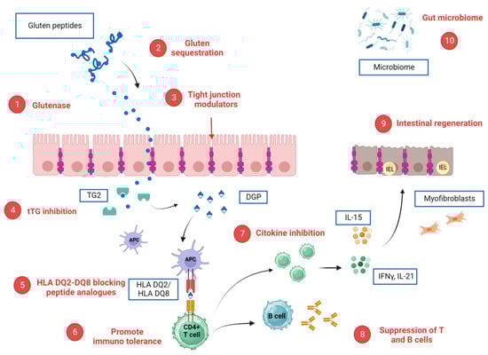 Potential CeD-specific therapeutic targets and corresponding investigational drugs. (1) glutenase: latiglutenase, STAN 1, AN-PEP, TAK-062; (2) Gluten sequestration: AGY, BL-7010; (3) tight junction modulators: larazotide; (4) tTG inhibition: ZED 1227; (5) HLA DQ2/DQ8 blocking peptide analogues; (6) promotion of immuno tolerance: Nexvax2, TIMP-GLIA and KAN 101; (7) cytokine inhibition. Anti-IL 15 (AMG714), Tofacitinib, anti CCR9R: CCX282-B; (8) suppression of B cells and T cells: rituximab and steroids; (9) intestinal regeneration: IMU 856; (10) gut microbiome: bifidobacterium longum, lactobacillus strains. Created with BioRender.com.