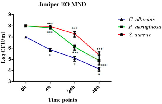 Temporal killing activity of juniper EO MNDs against three different microbial strains. Colony forming units (CFUs) were evaluated following the incubation of S. aureus, P. aeruginosa, and C. albicans in the presence of juniper EO MNDs, with evaluations conducted at 4 h, 24 h, and 48 h time points. The figure shows that juniper EO MNDs exhibited a significant reduction in CFUs of C. albicans at three time points (* p < 0.05). Similarly, a remarkable reduction in CFUs was observed for P. aeruginosa at 4 h, 24 h, and 48 h (*** p < 0.001). In the case of S. aureus, a substantial decrease in CFUs occurred after 24 h and 48 h of incubation (*** p < 0.001). The data presented represent a single experiment replicated three times.