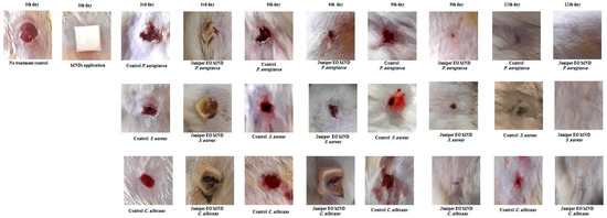 A histological examination was conducted to validate preliminary observations. The skin tissue was excised from the wound area and subjected to hematoxylin and eosin (H&E) staining. At the third day after infection with P. aeruginosa, S. aureus, and C. albicans, both the control (no treatment) group and the juniper MNDs group exhibited superficial ulceration, pus exudates, and neutrophil polymorph infiltration. By the 12th day post-infection, wounds infected with P. aeruginosa displayed chronic inflammation and fibroblast proliferation, wounds infected with S. aureus exhibited hyperkeratosis, chronic inflammation, and dense fibrosis, while wounds infected with C. albicans showed hyperkeratosis, acanthosis, dense fibrosis, and chronic inflammation. In contrast, histological studies after the 12th day of treatment revealed complete healing and the presence of normal tissue in wounds infected with P. aeruginosa, S. aureus, and C. albicans, as illustrated in Figure 4. These histopathological findings align with the obtained images, confirming complete healing after the 12th day of MND application. This treatment supports swift tissue recovery with fewer consequences of dysfunction, akin to first intention healing.