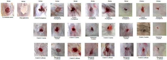 Juniper EO MNDs were applied to wounds infected with diverse microorganisms mimicking bacterial (P. aeruginosa and S. aureus) and fungal (C. albicans) infections. The untreated infected wounds served as the negative control group (empty MNDs), while gentamicin- and fluconazole-treated wounds acted as the positive controls for bacterial and fungal infections, respectively, as shown in (Figure 3). Wound healing progress was meticulously monitored and controlled at different time points (3, 6, 9, and 12 days) post-MND application, as depicted in Figure 2 and Figure 3. The results revealed a significant enhancement in wound healing compared to the control group, evident from the third day post-treatment. By the sixth day post-infection and treatment, the wound areas were notably smaller than those in the untreated group, with accelerated repair rates. Remarkably, the patches completely biodegraded alongside the healing process. All wounds infected with the three kinds of microorganisms achieved total healing after 12 days of treatment, surpassing both the negative control groups (unrepaired) and positive control groups (incompletely closed and healed).