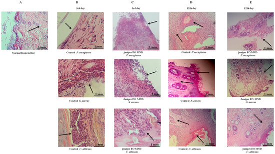 Histopathological comparison of wound healing in response to juniper EO MNDs treatment and control groups over time. The figure illustrates H&E staining of wounds infected with different microorganisms, comparing treated (juniper EO MNDs) and untreated (control) groups at different time points. (A) represents normal. (B) displays the control group (no treatment) at 3rd day after infection with P. aeruginosa, S. aureus, and C. albicans, showcasing acute inflammation, superficial ulceration, and pus exudates with neutrophil polymorphs infiltration. (C) depicts the juniper EO MNDs treatment at the same time point, demonstrating a similar inflammatory response. (D) shows the control group on the 12th day, revealing distinct histopathological features for each microbial infection. P. aeruginosa led to chronic inflammation and fibroblast proliferation. While S. aureus resulted in hyperkeratosis, chronic inflammation, and dense fibrosis (by scarring). The C. albicans-infected group showed hyperkeratosis, acanthosis, dense fibrosis, and chronic inflammation (as indicated by arrows). (E) At the 12th day after the juniper EO MND treatment of wounds infected with P. aeruginosa, S. aureus, and C. albicans, a positive response is demonstrated, with complete healing, reduced fibrosis, and scarring. Scale bar: 1 mm.