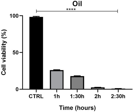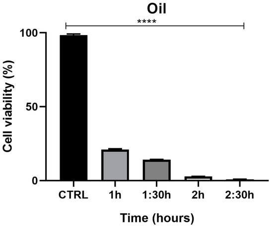 MTT assay summary for HaCaT cells exposed to juniper EO MNDs at different times: 1 h, 1.5 h, 2 h, 2.5 h. The graph illustrates cell viability reported as a percentage. Significant differences are observed among different essential oil exposure times, with higher cell viability corresponding to shorter oil exposure time and maximum cell toxicity corresponding to the longest exposure time (2.5 h). Statistical analysis was performed by analysis of variance with Bonferroni corrections (**** p < 0.0001).