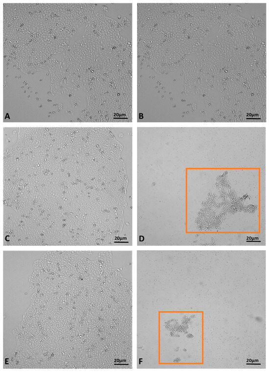 Dynamic assessment of HaCaT cells during juniper EO MNDs treatment. (A,B) Control cells at time zero and after 2.5 h. (C,D) Cells at time zero, prior to juniper EO MNDs addition, and after 1 h of treatment. (E,F) Cells at time zero, before adding juniper EO MNDs, and after 2.30 h of treatment. Orange boxes represent areas with surviving cells post-treatment. Scale bars: 20 µm.