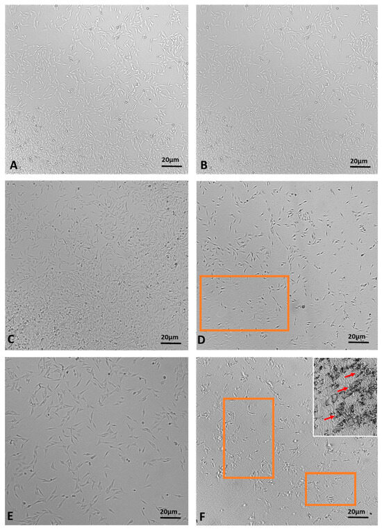Time-lapse images of PNT1a cells during juniper EO MNDs treatment. (A,B) Control cells at time zero and after 2.5 h. (C,D) Cells at time zero, before adding juniper MNDs, and after 1 h of treatment. (E,F) Cells at time zero, before adding juniper EO MNDs, and after 2.5 h of treatment; in (F) (top right), the residue of the juniper EO microneedles/oil is visible. The orange boxes represent areas with decreased cell numbers. Arrows indicate juniper microneedles/oil. Scale bars: 20 µm.