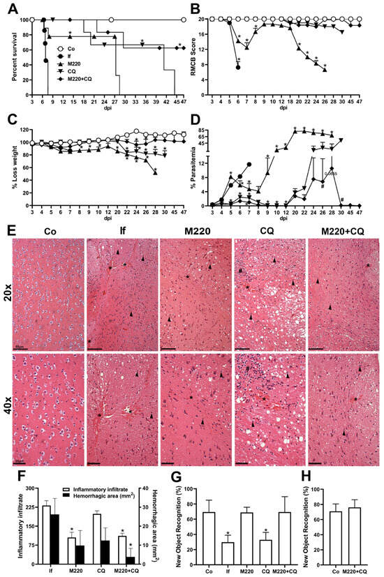M220 increases survival and efficiently preserves cognitive functions of PbA-infected mice. C57Bl/6 mice were intraperitoneally (i.p.) infected with 1 × 105 erythrocytes parasitized with PbA. Mice were treated with compound M220 (10 mg/kg) and/or CQ (30 mg/kg) via gavage, once a day, from 3 to 12 dpi. The following animal groups were created: uninfected (Co) mice that received only the vehicle; infected (If) mice that received only the vehicle; infected+M220 (M220); infected+CQ (CQ); infected+M220+CQ (M220+CQ). The following parameters have been evaluated: (A) survival, (B) clinical score using the rapid murine coma and behavior scale (RMCBS) parameter, (C) weight loss, (D) parasitemia. (E) Representative photomicrographs of H&E-stained brain sections (20× and 40×). Sections from an uninfected mouse with normal histological appearance (Co) and a PbA-infected mouse (If) showing multiple inflammatory infiltrates (arrow), bleeding areas (asterisks), and inflammatory foci (hashtag) at 5 dpi. In particular, treatment with M220+CQ reduced the brain injury observed at 5 dpi. The bars in the image represent 50 μm. (F) Hemorrhagic area (mm2) of brain tissue. (G) and (H) Cognitive assessment through object recognition test performed at 5 (G) and 47 (H) dpi. Data are representative of at least two independent experiments (4–6 mice/group) and shown as the mean ± SEM. Statistical analysis was performed using one-way analysis of variance (ANOVA) with Dunnett’s post-test, two-way ANOVA with Sidak’s post-test, and a log-rank (Mantel–Cox) test. # for comparison of the CQ group vs. the M220+CQ group; * for comparison of treated infected groups vs. untreated infected group. # or * p < 0.05.