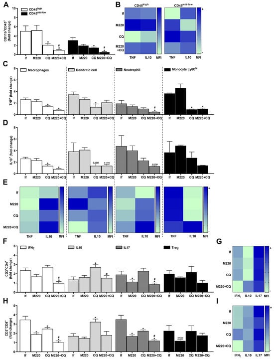 Effects of M220 on brain inflammation during PbA infection in mice. C57Bl/6 mice were infected with PbA and treated as described in Figure 2. Mice were sacrificed at 5 dpi, their brains were harvested and homogenized, and resident and sequestered cell populations were analyzed by flow cytometry. (A) CD11b+CD45hi and CD11b+CD45mid-low cells. (B) Heat map row representing mean fluorescence intensity (MFI) of TNF and IL-10 in CD11b+CD45mid-low; (C) and (D) CD11b+F4/80+ cells (macrophages), CD11c+F4/80- (DCs), CD11b+Ly6G+ (neutrophils), and Ly6G-Ly6Chi (Ly6Chi monocytes) positive for TNF (C) and IL-10 (D). (E) Heat map representing the MFI of TNF and IL-10 in macrophages, DCs, neutrophils, and Ly6Chi monocytes. (F) CD3+CD4+ lymphocytes were positive for IFN-γ, IL-10, IL-17A, and Foxp3 (Treg). (G) Heat maps representing MFI of IFN-γ, IL-10, and IL-17A in CD4+ lymphocytes. (H) CD3+CD8+ lymphocytes positive for IFN-γ, IL-10, IL-17A, and Foxp3 (Treg). (I) Heat map representing MFI of IFN-γ, IL-10, and IL-17A in CD8+ lymphocytes. In all heat maps, the color scale corresponds to relative MFI levels for each cytokine analyzed (data are presented in grayscale; black indicates the highest cytokine MFI levels, and white indicates the lowest cytokine MFI levels). Data presented in the graphs represent normalized cell number changes in uninfected control mice. Data are representative of two independent experiments (6 mice/group) and are shown as the mean ± SEM. Statistical analyses were performed using one-way ANOVA with Tukey’s post hoc test, two-way ANOVA with Sidak’s post-test, and Student’s t-test. # to compare the CQ group with the M220+CQ group; * for comparison of infected treated groups vs. infected untreated group. * or # p < 0.05.
