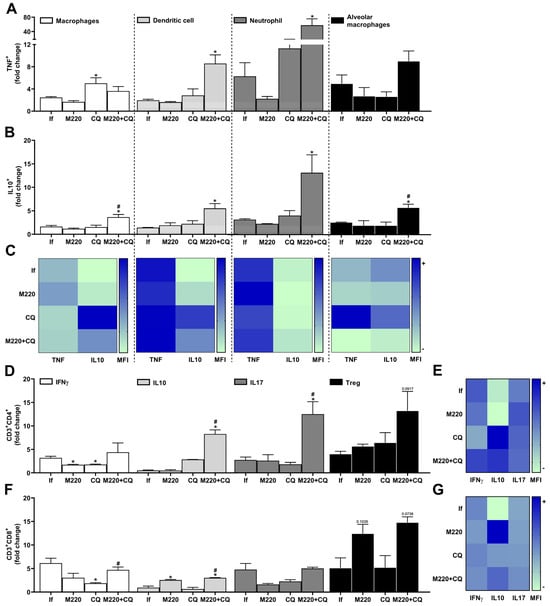 Effects of M220 on PbA-induced inflammatory response in the lung. C57Bl/6 mice were infected with PbA and treated as described in Figure 1. Mice were sacrificed at 5 dpi, lungs were harvested and homogenized, and resident and sequestered cell populations were analyzed by flow cytometry. (A) and (B) CD11b+F4/80+ (macrophages), CD11c+F4/80- (DCs), CD11b+Ly6G+ (neutrophils), and SinglecF+CD11c+ (alveolar macrophages) cells were positive for TNF (A) and IL-10 (B). (C) Heat map representing the median fluorescence intensity (MFI) of TNF and IL-10 in macrophages, DCs, neutrophils, and alveolar macrophages. (D) CD3+CD4+ lymphocytes were positive for IFN-γ, IL-10, IL-17A, and Foxp3 (Treg). (E) Heat map representing the MFI of IFN-γ, IL-10, and IL-17A in CD4+ T cells. (F) CD3+CD8+ lymphocytes were positive for IFN-γ, IL-10, IL-17A, and Foxp3 (Treg). (G) Heat map representing the MFI of IFN-γ, IL-10, and IL-17A in CD8+ T cells. In all heat maps, the color scale corresponds to relative levels of the MFI for each cytokine analyzed (data are presented in grayscale; black indicates the highest cytokine MFI levels, and white indicates the lowest cytokine MFI levels). The data presented in the graphs represent fold-changes in cell numbers normalized to uninfected control mice. Data are representative of at least two independent experiments (three mice/group) and shown as the mean ± SEM. Statistical analysis was performed using one-way ANOVA variance with Tukey’s post hoc test and Student’s t-test. # for comparison of CQ group vs. M220+CQ group; * for comparison of infected treated groups vs. infected untreated group. * or # p < 0.05.