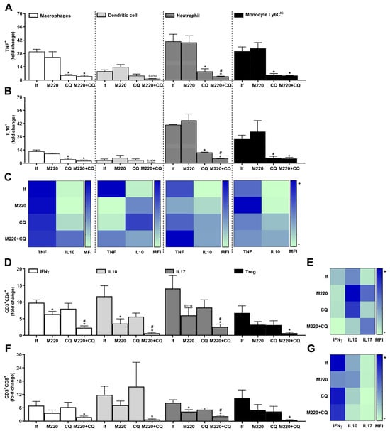 Effects of M220 on innate and adaptive cells profile in the spleen of PbA-infected mice. C57Bl/6 mice were infected with PbA and treated as outlined in the legend of Figure 2. Mice were sacrificed at 5 dpi, spleens were harvested and homogenized, and splenocytes were analyzed by flow cytometry. (A) and (B) CD11b+F4/80+ cells (macrophages), CD11c+F4/80- (DCs), CD11b+Ly6G+ (neutrophils), and Ly6G-Ly6Chi (Ly6Ch monocytes) were positive for TNF (A) and IL-10 (B). (C) Heat map depicting the mean fluorescence intensity (MFI) of TNF and IL-10 in macrophages, DCs, neutrophils, and Ly6Ch monocytes. (D) CD3+CD4+ lymphocytes were positive for IFN-γ, IL-10, IL-17A, and Foxp3 (Treg). (E) Heat map representing the MFI of IFN-γ, IL-10, and IL-17A in CD4 + T cells. (F) CD3+CD8+ lymphocytes were positive for IFN-γ, IL-10, IL-17A, and Foxp3 (Treg). (G) Heat map representing the MFI of IFN-γ, IL-10, and IL-17A in CD8+ T cells. In all heat maps, the color scale corresponds to the relative levels of MFI for each cytokine analyzed (data are presented in grayscale; black indicates the highest cytokine MFI levels, and white indicates the lowest cytokine MFI levels). Data presented in the graphs represent normalized cell number changes in uninfected control mice. Data are representative of two independent experiments (six mice/group) and are shown as the mean ± SEM. Statistical analysis was performed using one-way variance ANOVA with Tukey’s post hoc test and Student’s t-test. # to compare the CQ group with the M220+CQ group; * for comparison of infected treated groups vs. infected untreated group. * or # p < 0.05.