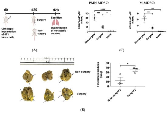 Initial studies were carried out to confirm the effect of surgery on lung tumor cell metastasis. Female BALB/c mice received orthotopic implantation of the murine mammary adenocarcinoma cell line (4T1). Subsequently, the solid tumor mass was surgically removed 20 days after implantation (Figure 1A). We confirmed the presence of lung metastasis in both mice with intact primary tumors (non-surgery mice) and mice that had undergone primary tumor resection (surgery mice) at 28 days PTI. Surgery mice had a significant (p ≤ 0.05) increase in lung metastatic growth, demonstrated by a greater number of lung metastatic nodules compared to mice with intact primary tumors (non-surgery) (Figure 1B). Accompanying an increase in lung metastasis among surgery mice was a significant (p ≤ 0.05) reduction in the percentage of CD11b+ polymorphonuclear MDSC-like cells (PMN-MDSCs; Ly6G+Ly6C+) and mononuclear MDSC-like cells (M-MDSCs; Ly6G+Ly6C−) detected in the bronchioalveolar lavage fluid of surgery mice compared to non-surgery mice (Figure 1C).
