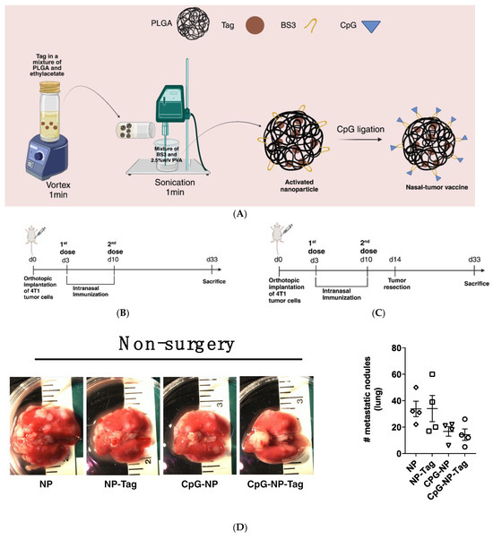 Increasing evidence supports the metastatic-promoting influence of the surgical removal of primary tumors, which is intended to be curative for most solid tumors [14,15,16]. This has been attributed mainly to the increased shedding of tumor cells into circulation during surgery, an increased inflammatory response to surgical injury, and a significant suppression of antitumor immune responses post-surgery [17,18,19]. Targeting and reprogramming the lung microenvironment to increase tumor immunosurveillance presents an attractive opportunity to improve anticancer immunotherapy by halting secondary lung metastasis. Over the years, cancer vaccines have been used to induce antitumor immunity within the tumor microenvironment by stimulating endogenous T cells to attack tumor cells [20,21,22]. Accordingly, we have recently engineered an intranasal cancer vaccine (CpG-NP-Tag), utilizing targeted nano-vaccine delivery to pre-empt secondary lung metastasis by priming and boosting antitumor immunity in the lung [23]. We showed that our nasal nano-vaccine-induced localized mucosal-associated effector T cells and antibody immune responses were associated with a significant reduction in lung colonization by 4T1 cells, which are highly carcinogenic with high proclivity to metastasize to the lung in female BALB/c mice.
