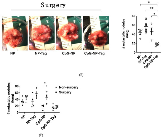 To evaluate the implication of primary tumor resection on lung metastasis, tumors were surgically removed from tumor-bearing mice 20 days after tumor establishment in the mammary fat pad (Figure 1A). For the evaluation of vaccine efficacy, primary tumors were surgically removed 4 days after the second intranasal administration of NP formulations in tumor-bearing mice (Figure 2B). The primary tumors were completely removed as previously described [38,39]. Buprenorphine (0.005 mg/kg; sc) was administered promptly after surgery and again 12 h later for pain management.