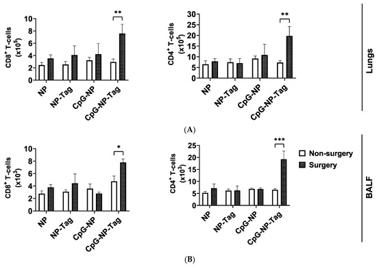 To understand why intranasal CpG-NP-Tag immunization can significantly reduce surgery-induced accelerated secondary lung metastasis, we assessed the effect of CpG-NP-Tag nasal immunization on the infiltration and effector functions of T cell in the lungs of NP-immunized mice for both non-surgery and surgery mice. Flow cytometry analysis confirmed that CpG-NP-Tag immunization significantly (p ≤ 0.05) increased the numbers of CD8+ and CD4+ T cells that infiltrated the lungs and BALF of surgery mice but not in non-surgery mice (Figure 3A,B). In contrast, the numbers of CD8+ and CD4+ T cells that infiltrated the lungs and BALF of control (CpG-NP, NP-Tag, and NP immunized) surgery mice and non-surgery mice were not significantly altered (Figure 3A,B).