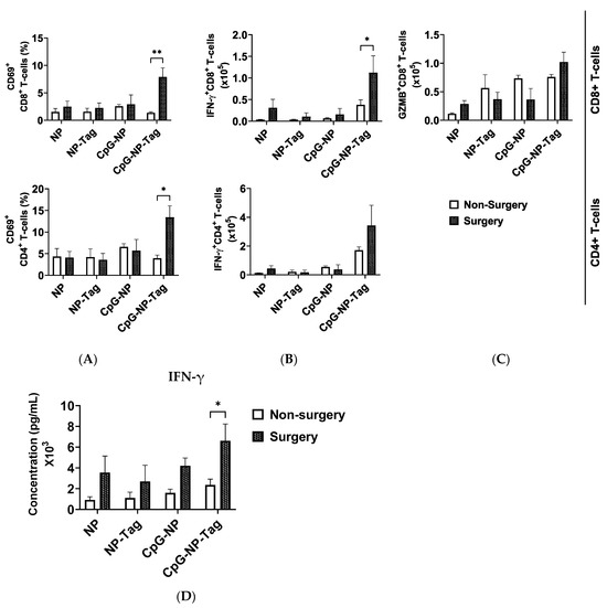 Having confirmed that CpG-NP-Tag intranasal immunization induced a T cell immune response in both non-surgery and surgery mice by comparing the proportions of activated and functional T cells in the lungs of the experimental mice, we next evaluated the effect of CpG-NP-Tag nasal vaccination on the infiltration of T cells with effector functions in the lungs of both non-surgery- and surgery-immunized mice. Specifically, we compared the numbers instead of the proportions of activated (CD69+) and functional (IFN-γ and GZMB production) CD8+ and CD4+ T cells that infiltrated the lungs of non-surgery and surgery mice following polyclonal restimulation with anti-CD3/CD28 antibodies. We observed a significant (p ≤ 0.05) increase in the number of CD8 and CD4 T cells expressing CD69 in the lungs of CpG-NP-Tag vaccinated surgery mice compared to non-surgery, while, at the same time, the number of CD8 and CD4 T cells expressing CD69 in the lungs of NP control vaccinated mice remained unaffected in non-surgery and surgery mice (Figure 4A). The number of IFN-γ-producing T cells was significantly (p ≤ 0.05) increased among CD8+ T cells but not CD4+ T cells in CpG-NP-Tag-vaccinated surgery mice compared to non-surgery vaccinated mice. However, the numbers of CD8 and CD4 T cells that produced IFN-γ remained unaltered across non-surgery and surgery mice immunized with NP controls (Figure 4B). Differences in GZMB-producing CD8+ T cells were not found in both CpG-NP-Tag and NP control, vaccinated mice (Figure 4C). The increase in the number of IFN-γ-producing CD8+ T cells that infiltrated the lungs of surgery CpG-NP-Tag-vaccinated mice was accompanied by a significant (* p ≤ 0.05) rise in the concentration of IFN-γ quantified in culture supernatants when lung leukocytes were stimulated for 4 days in the presence of anti-CD3/CD28 antibodies. (Figure 4D). Thus, nasal nano-vaccination promoted antitumor IFN-γ-producing CD8+ T cells in lungs counteracting the immunosuppressive effect of the surgical resection of the primary tumor.