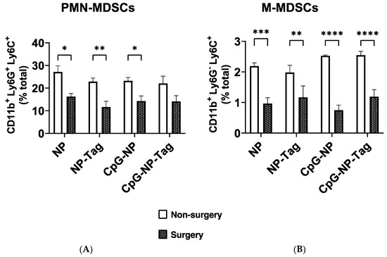 Breast tumors establish metastasis at distal organs such as the lungs by propagating CD11b+ MDSCs to metastatic sites to create a convivial microenvironment to support lung metastasis by inducing inflammation and immunosuppression, as mentioned earlier. Several mechanisms via CD11b+ MDSCs are used to inhibit antitumor T cell responses including reducing T cell proliferation and inducing the apoptosis of T cells [24,25,26]. Given the significant (p < 0.05) reduction in the percentages of lung metastasis promoting CD11b+ MDSC-like cells in the bronchioalveolar lavage fluid of surgery-treated unimmunized mice compared to non-surgery unimmunized mice (Figure 1C), we hypothesized that vaccine efficacy is increased in surgery mice through the subversion of the primary tumor-induced infiltration of CD11b+ MDSC-like cells propagated to the lungs and allowing for the infiltration of antitumor IFN-γ-producing CD8+ T cells. We observed a significant (p ≤ 0.05) decrease in the accumulation of both PMN-MDSCs and M-MDSCs in the lungs of nasal nano-vaccinated surgery mice compared to non-surgery mice (Figure 5A,B).