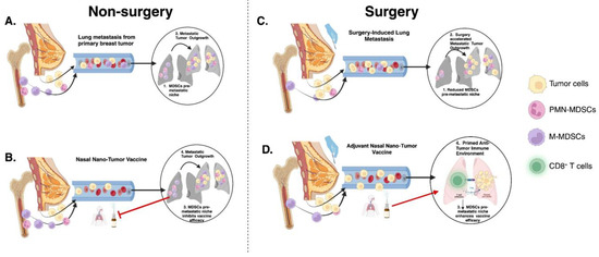 Schematic illustration of nasal nano-vaccine efficacy in non-surgery and surgery conditions: (A) Primary breast tumor induces propagation of MDSCs into the lungs to promote metastasis. (B) MDSCs pre-metastatic niche inhibits nasal nano-vaccine efficacy at preventing lung metastasis. (C) Primary breast tumor resection reduces pre-metastatic MDSCs but aggravates lung metastasis. (D) Nasal nano-vaccine inhibits surgery-enhanced lung metastasis due to a reduction in pre-metastatic MDSCs.