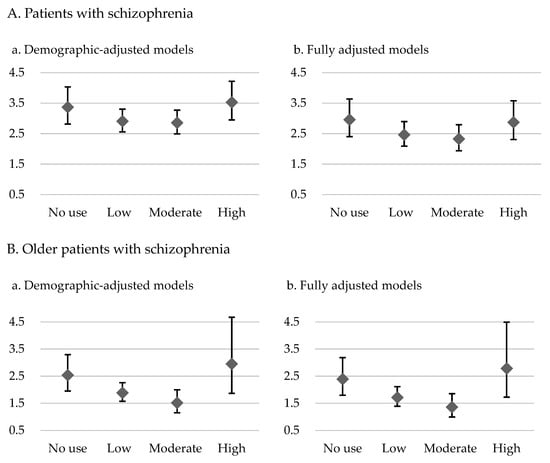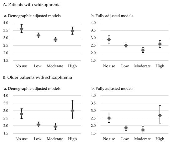 In the current study, the older patients with schizophrenia had the highest risk of overall and CVD-related mortality in the high antipsychotic exposure group (Figure 1 and Figure 2), although the confidence intervals were overlapping across certain groups. Table 2 revealed that among the older patients with schizophrenia, those in the low and moderate exposure groups had lower overall mortality than did those in the no and high exposure groups, with nonoverlapping confidence intervals. However, for CVD mortality, the confidence intervals overlapped across the groups with different exposure levels, despite the illustrated U-shaped curves. The side effects of antipsychotics, which can affect all patient populations, may be particularly pronounced in older patients, because age-related changes can amplify these effects []. For example, age-related changes in hepatic and renal functions markedly affect the absorption, distribution, metabolism, and excretion of drugs. Liver mass, hepatic blood flow, serum albumin levels, and renal blood flow and function tend to decrease with age []. In addition, age-related alterations in body composition can affect the pharmacokinetics of antipsychotics in older patients. These changes may involve a decrease in lean muscle mass and total body water and an increase in total body fat []. Moreover, because of age-related increases in monoamine oxidase activity, in older patients, the central nervous system exhibits heightened sensitivity to antipsychotic drugs. In addition, a reduction in cerebral blood flow and a selective decline in some nerve pathways were reported in older patients. Furthermore, the age-related loss of cholinergic neurons and the exacerbation of cholinergic deficits by these drugs increased the sensitivity of older patients to medications exerting anticholinergic effects []. Older patients with schizophrenia may have comorbid chronic diseases, such as CVD and diabetes, and antipsychotic use may increase the difficulty of managing these diseases []. A study revealed that both first- and second-generation antipsychotics were associated with an increase in the risk of mortality among older patients [], and dosage may be a key determinant of antipsychotic safety, which affects mortality risk []. In summary, low or moderate doses of antipsychotics may be sufficient for treating older patients with schizophrenia, and as patients advance in age and their physical health condition changes, clinicians should adjust the dosage of antipsychotic medications. For older patients with schizophrenia, high exposure to antipsychotic medications is not generally recommended. If high doses of antipsychotic medication are required, clinicians must closely monitor for associated side effects and potential risk factors.