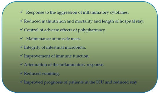 - Reduction in amino acid metabolism. It is necessary for nutritional support to maintain adequate metabolic pathways without causing redistributions that compromise the functionality and structure of the organs. The importance of protein intake has been observed in EL patients, resulting in reduction in infectious complications, hospital stay, morbidity associated with energy excess, and in turn reduced mortality in cases of sepsis [25].