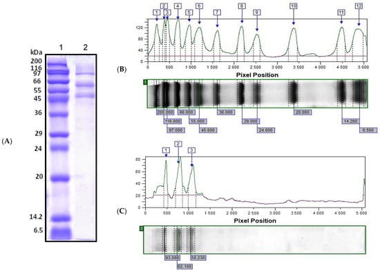 (A) Depiction of 12.0% SDS-PAGE analysis, visualized by staining with Coomassie G-250. Positions: (1) protein marker in the range 6.5–200 kDa (SigmaMarkerTM, Sigma-Aldrich, Saint Louis, MO, USA); (2) fraction from R. venosa hemolymph with MW 50–100 kDa. (B) Electrophoretic profile of a standard protein molecular marker (electrophoretic Lane 1) analyzed by ImageQuantTM TL. (C) Analysis of the electrophoretic profile of fraction Rv 50–100, electrophoretic Lane 1, using ImageQuant™ TL v8.2.0 software.