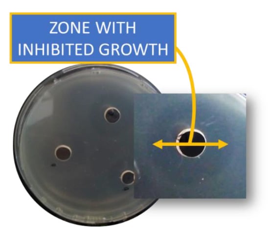 Areas without growth of the test microorganisms were not registered when the protein fraction was inoculated onto the surface and within the depth of the medium for cultivation of E. coli NBIMCC 8785. At the same time, areas around the wells were found in which the growth of E. coli was inhibited. These areas can be clearly seen in the deep cultivation illustrated in Figure 3. This effect is likely attributed to the complexity of the investigated protein fraction. Our speculation was that the inhibitory effect occurs in two phases, influenced by proteins within the fraction with different mobility (transportation) in the nutrient media.