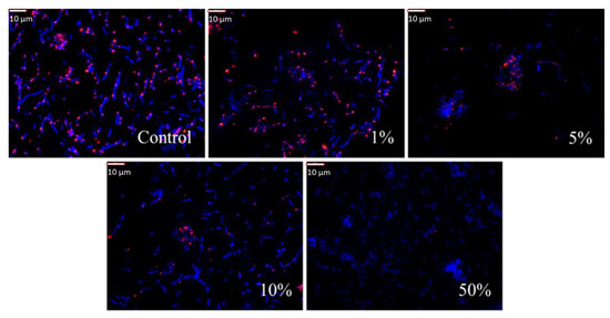 On the other hand, not only the elimination of bacteria but also the inhibition of surviving cells is important for the antibacterial effect. The results illustrated in Table 2 show that not only was the number of living pathogenic cells greatly reduced in the presence of the protein fraction from R. venosa, but the remaining living cells also had significantly lowered metabolic activity. Compared with the control, the decrease was approximately 27%. This was evidence of inhibition of the metabolic activity of E. coli.; i.e., the active substances in the studied fraction at concentrations of 1–10% caused the elimination of up to 72% of the bacteria. This was associated with serious morphological changes in pathogenic cells. Their size was up to 47% less than that of the bacteria in the control sample, which again confirmed the inhibition of their metabolism resulting in a decrease in cell size. These effects can be caused by various environmental stressors, including toxic substances []. The obtained results showed that the protein in the fraction with MW 50–100 kDa contained different types of proteins, so the biologically active ones were at even lower concentrations than the ones used as a complex fraction. A significant antibacterial effect was detected at the modest 5% concentration (Figure 5), making the possibility of low potency for the active compounds very unlikely.