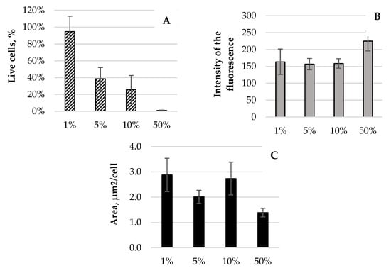 Digital analysis of images obtained from the fluorescent staining of E. coli samples with 1%, 5%, 10% and 50% of the protein fraction with MW 50–100 kDa from the hemolymph of R. venosa: (A) percentages of alive cells in the samples; (B) fluorescence intensity; (C) average areas of cells in the samples.