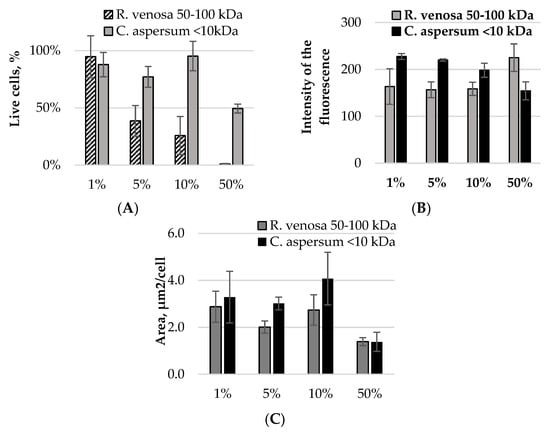 Digital analysis of images obtained from the fluorescent staining of E. coli samples with 1%, 5%, 10% and 50% of the fraction with MW 50–100 kDa from R. venosa and the fraction with MW below 10 kDa from C. aspersum: (A) percentages of living cells in the samples; (B) fluorescence intensity; (C) average areas of the cells in the sample.