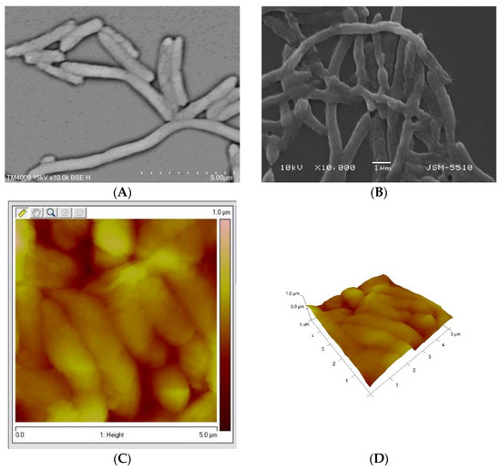 Illustration of the antibacterial damaging effect of a 10% solution of hemolymph from Rapana venosa against E. coli NBIMCC 8785. (A) control 18 h culture of E. coli NBIMCC 8785. (B) E. coli NBIMCC 8785 after 6 h exposure to rapana hemolymph—10% solution. The damage to the surface layers of the bacterial cells is clearly visible with SEM. (C) E. coli NBIMCC 8785 after 6 h exposure to rapana hemolymph—10% solution. The damage to the surface layers of the bacterial cells is clearly visible with AFM-2D. (D) E. coli NBIMCC 8785 after 6 h exposure to rapana hemolymph—10% solution. The damage to the surface layers of the bacterial cells is clearly visible with AFM-3D.