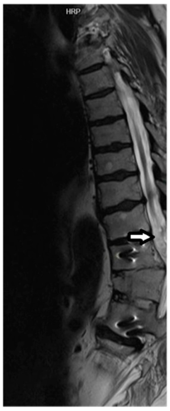 Sagittal T2 image demonstrating cord hyperintensity and volume loss proximal to the level of the TSCI (arrow). Cord T2 hyperintensity at the level of T11 vertebra corresponds to a neurological deficit found during the clinical exam. Metallic artifacts within the T11 and L1 vertebral bodies related to orthopaedic hardware from prior posterior decompression and fusion was observed. There is also a chronic anterior compression fracture of T12 noted.