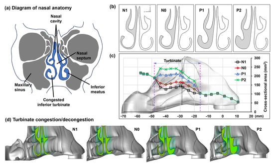 Variation in the left inferior meatus due to concha (turbinate) congestion/decongestion (N1–P2) within one nasal cycle: (a) diagram of nasal anatomy, (b) visualization of a selected cross section among N1–P2, (c) quantification of the cross-sectional area variation among N1–P2 in the turbinate region, and (d) turbinate morphological variation among N1–P2. N1: the left inferior meatus shrinks due to concha congestion; N0: normal; P1 and P2: the left inferior meatus dilates due to increasing concha decongestion.