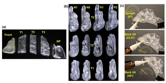 To quantify spray deposition distributions, each nasal model was divided into five sections, namely, the front nose, anterior turbinate (T1), middle turbinate (T2), posterior turbinate (T3), and nasopharynx (NP), as illustrated in Figure 2a. Changes in the morphology of the four nasal models were reflected in sections T1, T2, and T3 (Figure 2b). Lap joints were generated at the connecting ends to facilitate robust assembly and secure sealing. The assembled nasal casts (N1, N0, P1, and P2) were subsequently used in spray deposition tests with three head angles, i.e., upright (0°), 22.5° back tilt, and 45° back tilt (Figure 2c).