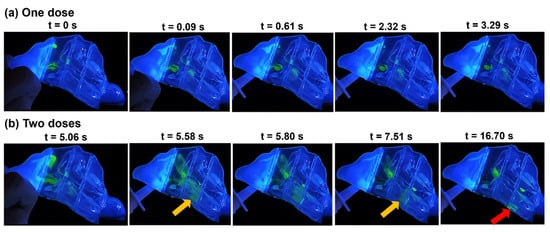 Figure 3 depicts the time-sequence visualization of the liquid droplet and film deposition of intranasally administered saline nasal spray within the N1 nasal model, representing the most congested stage in a nasal cycle after one- and two-dose applications at a head orientation of 22.5° tilted backward.