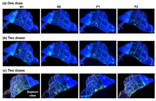 Liquid drop and film deposition within the various models with a 22.5° backward head tilt: (a) after one dose of spray application, (b) after two doses, and (c) after two doses captured from the septum side of each model.