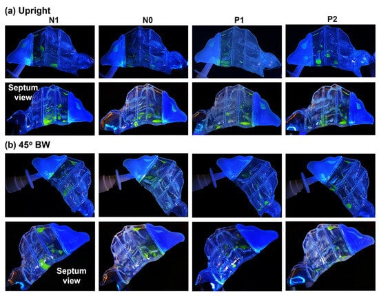 Liquid drop and film deposition within the various models after two doses of spray application with an (a) upright (0°) head angle and (b) 45° backward head tilt. The upper and lower panels in (a,b) are views from the lateral and septum side, respectively.