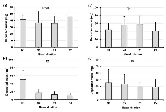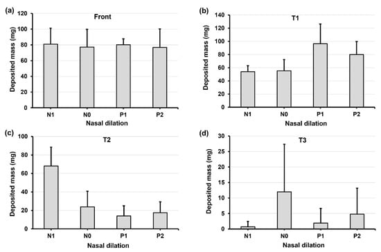 Figure 6 shows the deposition variation vs. nasal cycle (N1, N0, P1, and P2) in different regions of the nose (front nose, T1, T2, and T3) with an upright (0°) head position. Insignificant differences in deposition among N1–P2 are observed in the front nose (Figure 6a), which is expected because the nasal cycle affects only the turbinate region, not the front nose.