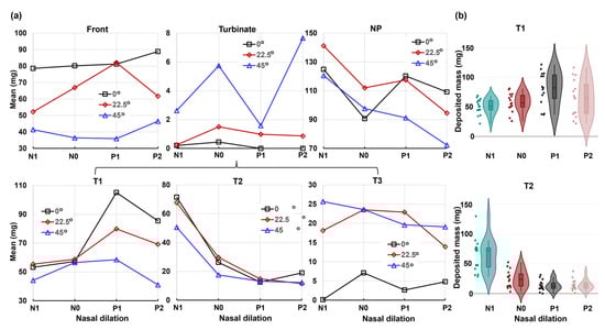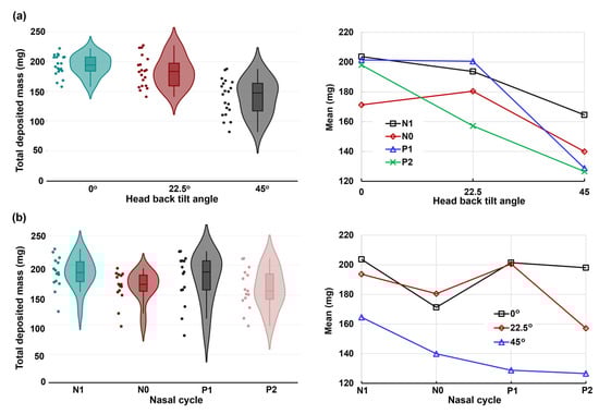 The violin and mean plots of the total deposited mass in four nasal models (N1–P2) and three head orientations: (a) head angle effect and (b) nasal dilation effect.
