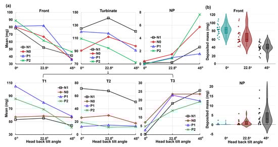 Factorial analyses vs. head angle for regional deposition in four nasal models (N1–P2): (a) mean plot and (b) violin plot.