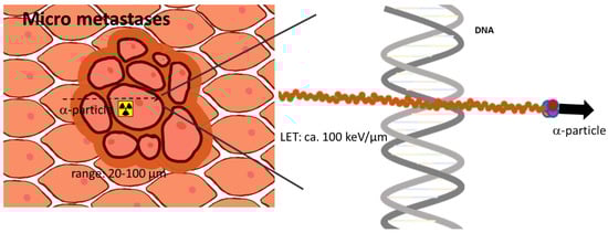 The ensemble between diagnostic and therapeutic radionuclides has opened a rapidly growing area for individualized targeted radionuclide theranostics. Recent developments and increasing knowledge in the field of radiation biology, radiochemistry, radiopharmaceutical sciences, nuclear medicine, and oncology are currently making steps forward to several more, highly relevant therapy options. One distinct research field is that of the therapeutic use of alpha particle-emitting radionuclides (alpha emitters). With their unique physical properties, it has been hypothesized that principles known, e.g., from external proton irradiation can be transferred to a systemic targeted internal radiotherapy, also called targeted endoradiotherapy, down to treating single cells. The physical properties of alpha emitters determining their biological potential are their short range in tissue with 50–80 µm and their high linear energy transfer (LET) along this track (Figure 1). With typical particle energies of 5–9 MeV, the resulting LET is approximately 80–100 keV/µm, which is orders of magnitude higher compared to beta or gamma radiation.